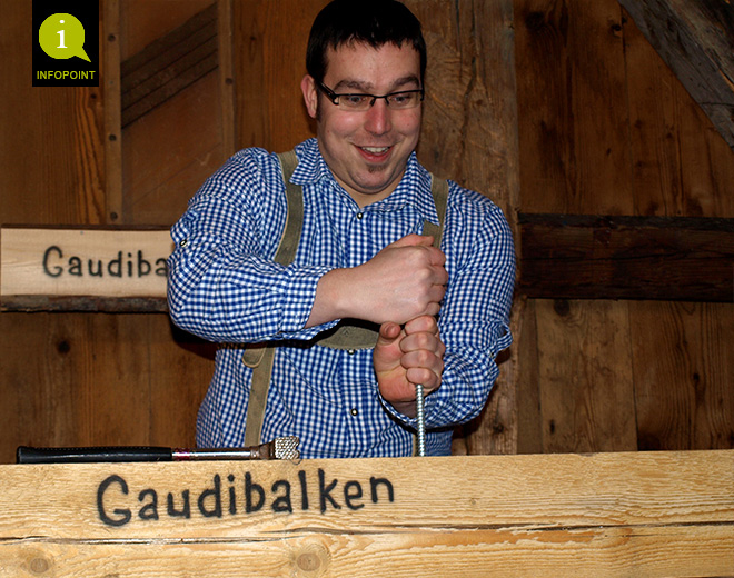 Die ½ Stündige Spielaktion für Alle! Wir suchen die Teilnehmer aus den Gästen aus, spielen und vergeben kleine Preise. Je 4-6 Personen müssen an unserm Gaudibalken gegeneinander antreten. Spiele wie: Wettnageln, Schraube drehen, melken, Bierdeckel fangen, Lehrgutwerfen, Holzklotz Stapeln, Übersetzungsspiel, Essensprobe u.mehr