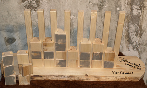 Zweipersonen-Strategiespiel mit dem Ziel, als Erster vier der eigenen Spielsteine in eine Linie zu bringen.