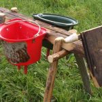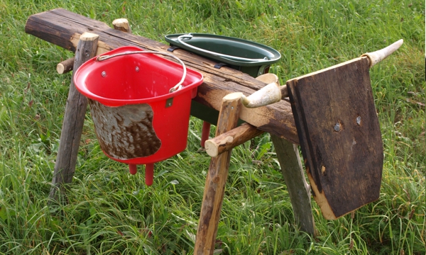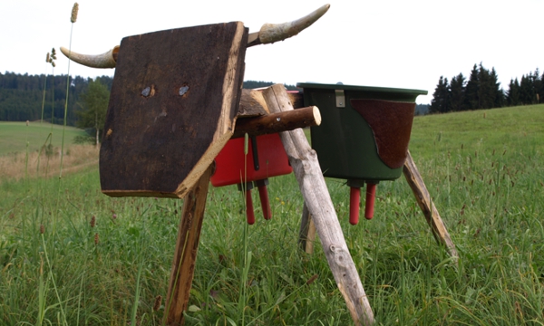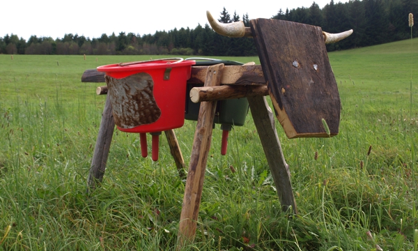 Wettkampf – Melkstation Hier können zwei Personen gegeneinander Wettmelken. Lieferumfang: Holzkuh mit Original Kuhhörner. 2 Melkeimer, 2 Blecheimer, 2 Messbecher, 2 Holz-Sitzrollen